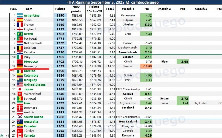 9月6日讯 德国队活着初赛0-2不敌斯洛伐克后,海外足球博主“_cambiodejuego”阐明关系公式,计较出了德国队及时FIFA名次。