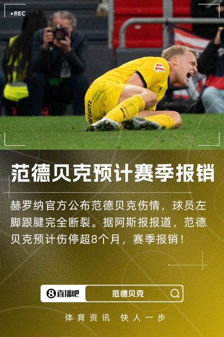 赛季报销!官方:范德贝克跟腱全皆断裂,西媒瞻望将伤停超8个月