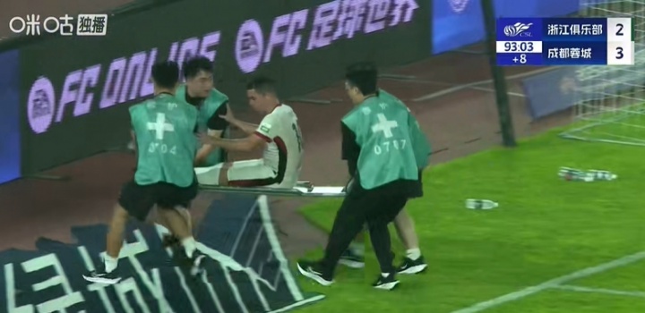 罗慕洛一度不肯被担架抬下场,最终被浙江担架队“火速”送出场外