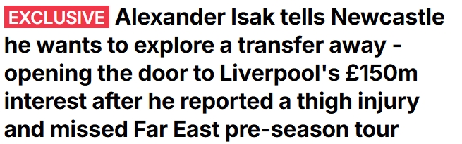 邮报独家:伊萨克奉告纽卡我方思寻求转会 利物浦挑升1.5亿镑签他