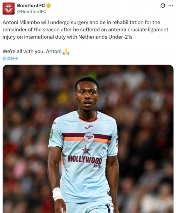 官方:布伦特福德中场米兰博十字韧带受伤,缺席赛季剩余比赛