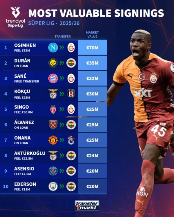 今夏土超新援德回身价榜:奥斯梅恩7000万欧居首,杜兰、萨内前三