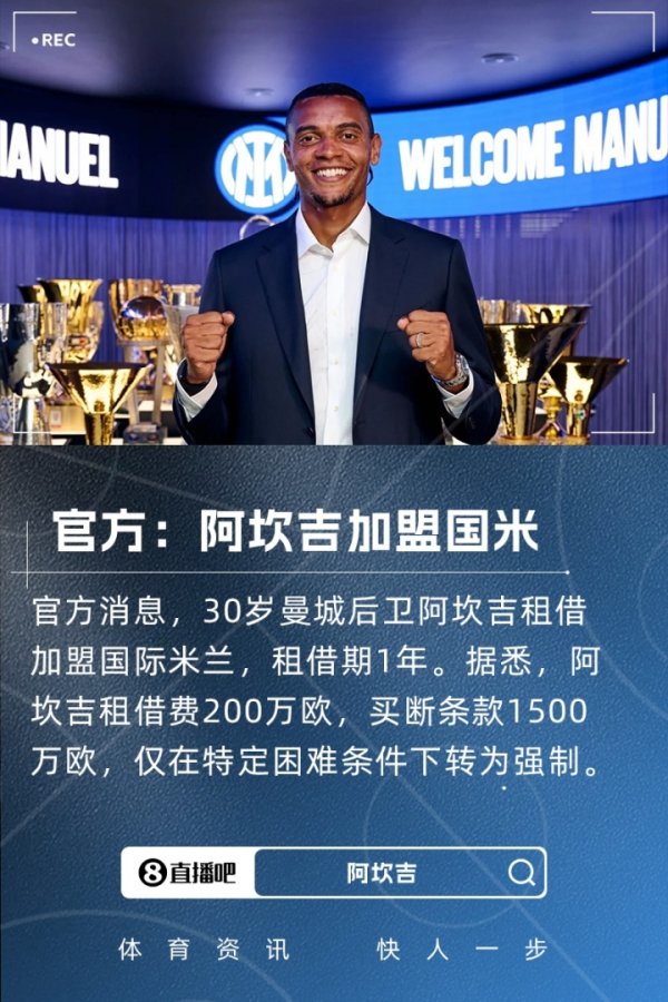 9月2日讯 官方音讯,国米租赁签下阿坎吉,200万租赁费+1500万欧有条件强制买断条件。 国米官方公告写说念:这位1995年出身的瑞士后卫以租赁体式从曼城加盟,公约中包含可接受的买断条件,以及在特定条件触发时的强制买断公约。 罗马诺知道,来去为200万欧元租赁费,1500万欧元买断条件,仅在餍足特定厚爱条件时转为强制见效。报说念称,淌若阿坎吉出场至少50%况兼国米赢惬心甲冠军,则该条件转为强制买断条件。 阿坎吉现年30岁,司职后卫,上赛季代表曼城各赛事出场37次,孝敬1助。......查看更多