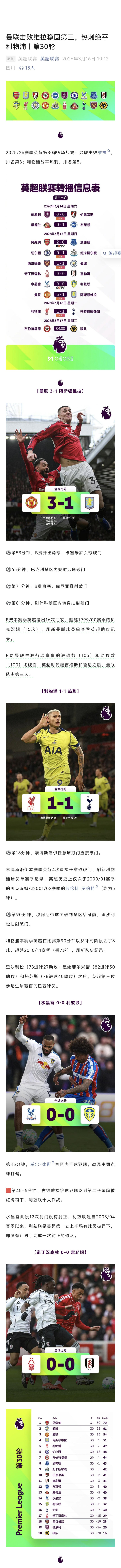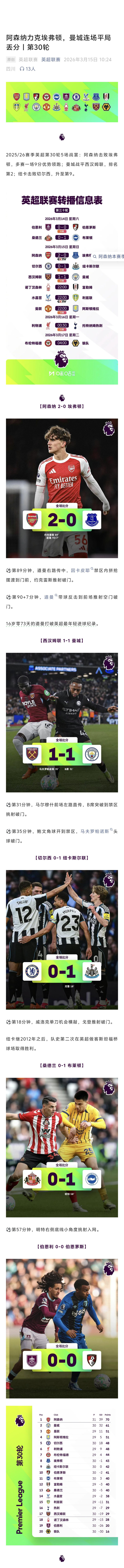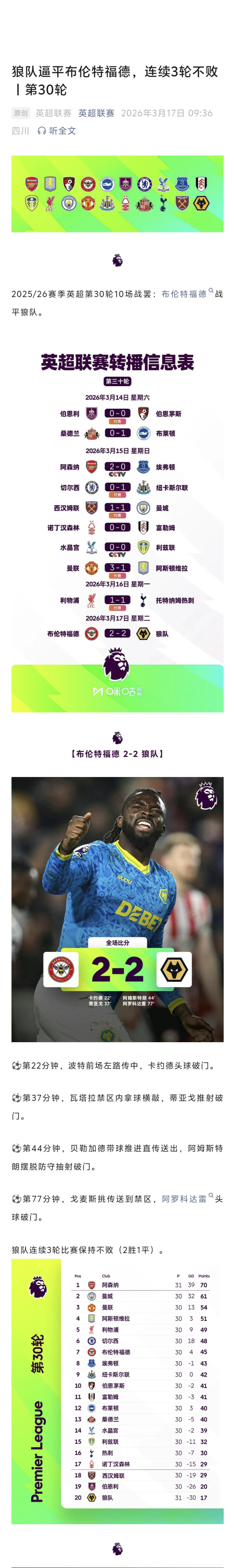 北京时间3月17日凌晨布伦特福德2比2战平狼队,英超第30轮十场赛事 全部结束。阿森纳2比0击败埃弗顿,而曼城造访伦敦则是1比1遭西汉姆联顽强逼平,阿森纳借此机会将积分领跑 优势扩大至9分(多赛一场),而曼联3比1力克阿斯顿维拉,积54分领跑 后者3分,坐稳第3。利物浦主场作战 遭热刺1比1绝平,未能反超维拉,但仍跨越 本轮0比1负于纽卡斯尔联的切尔西,升至第5,蓝军则排名第6。