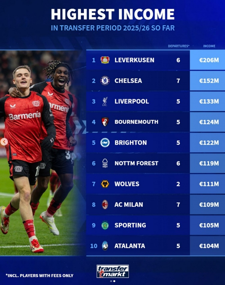 当今夏窗出售球员收入榜:勒沃库森居首,切尔西次席,赤军第三