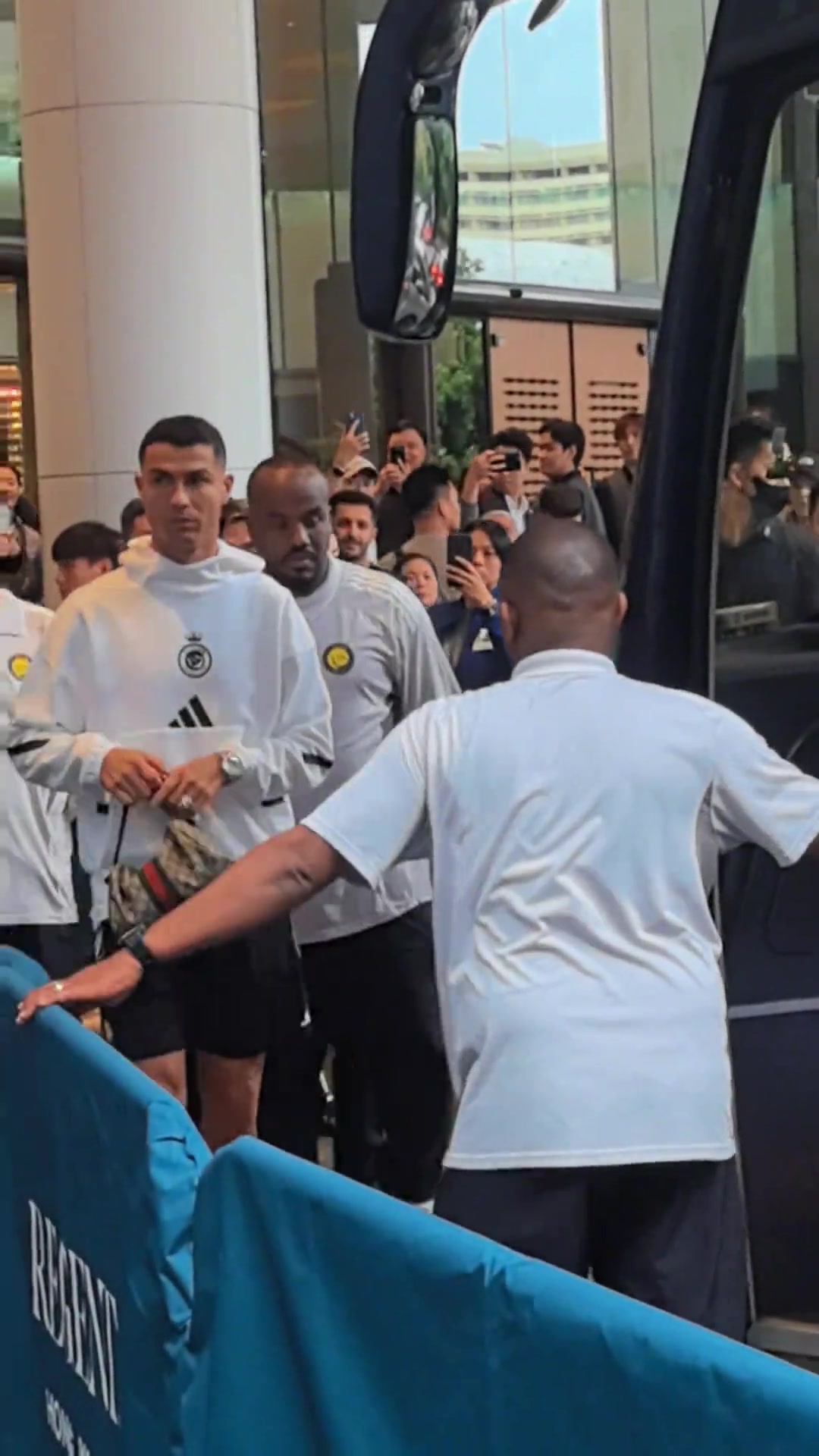 C罗上大巴前朝球迷比大拇指,手里还拿了一个葡萄牙球衣的Labubu