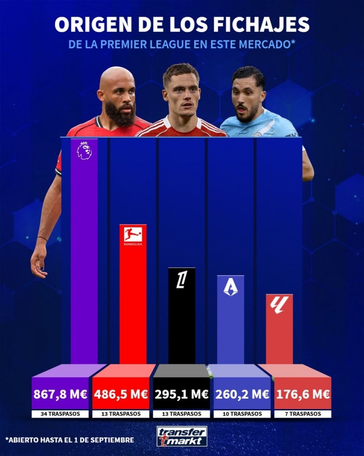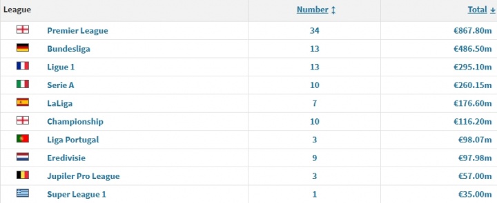 英超夏窗引援源头:里面共34东谈主超8亿欧居首,德甲13东谈主近5亿欧第二