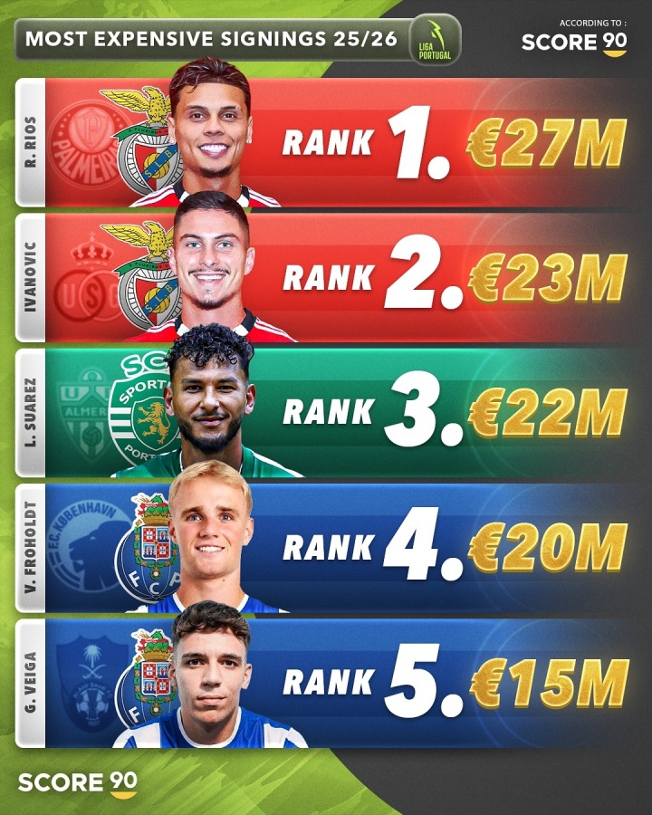 黑店进货!今夏葡超TOP5引援:葡超三强霸榜,里奥斯2700万欧居首