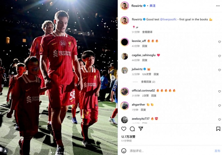 维尔茨也在赛后通过社媒晒出我方的比赛照,并配文:“很好的测试赛@利物浦,首球入账💪📍日本”。