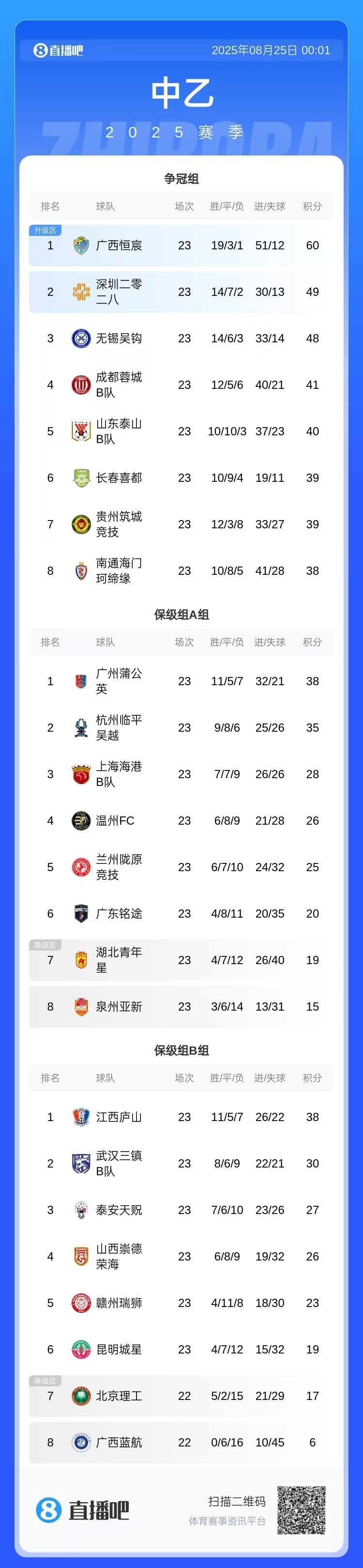 8月24日讯 中乙决赛阶段第23轮比赛抵制,广西恒宸和深圳二零二八暂居争冠组前二,湖北后生星和泉州亚新暂列保级A组后两名,北京理工和广西蓝航在少赛一场的情况下暂列保级B组后两名。