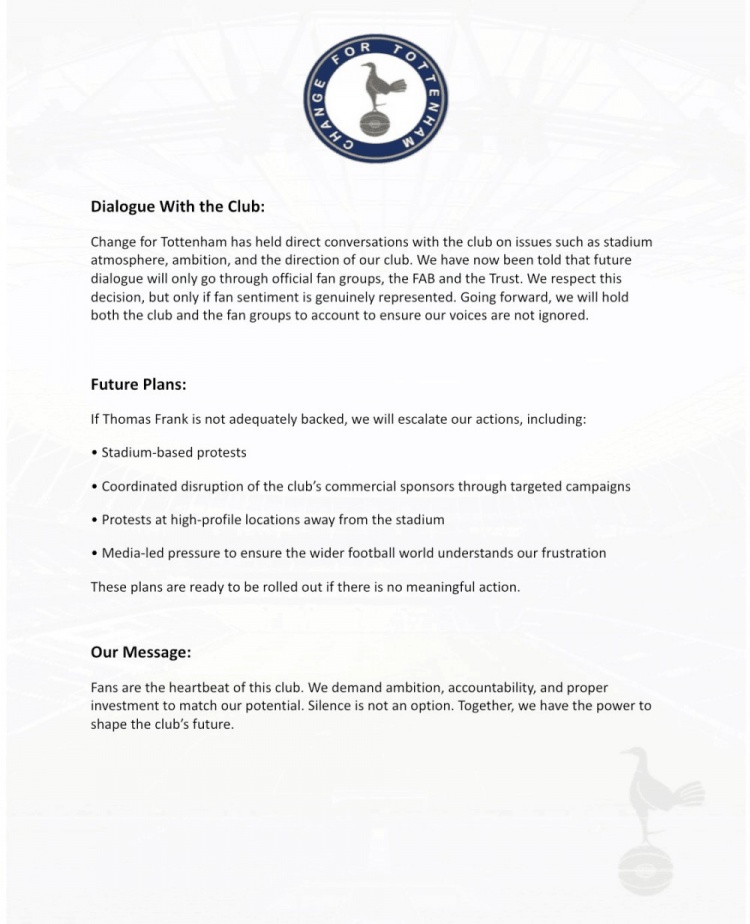 “change for tottenham”已与俱乐部就球场氛围、赛季目的和俱乐部发展标的等问题进行了径直疏浚。现时被见告曩昔的对话将仅通过官方球迷组织、球迷论坛和信托机构进行。咱们尊重这一决定,但前提是这些机构和渠说念能真实传达球迷的看法。曩昔咱们将监督俱乐部和球迷组织,确保咱们的声息不会被忽视。