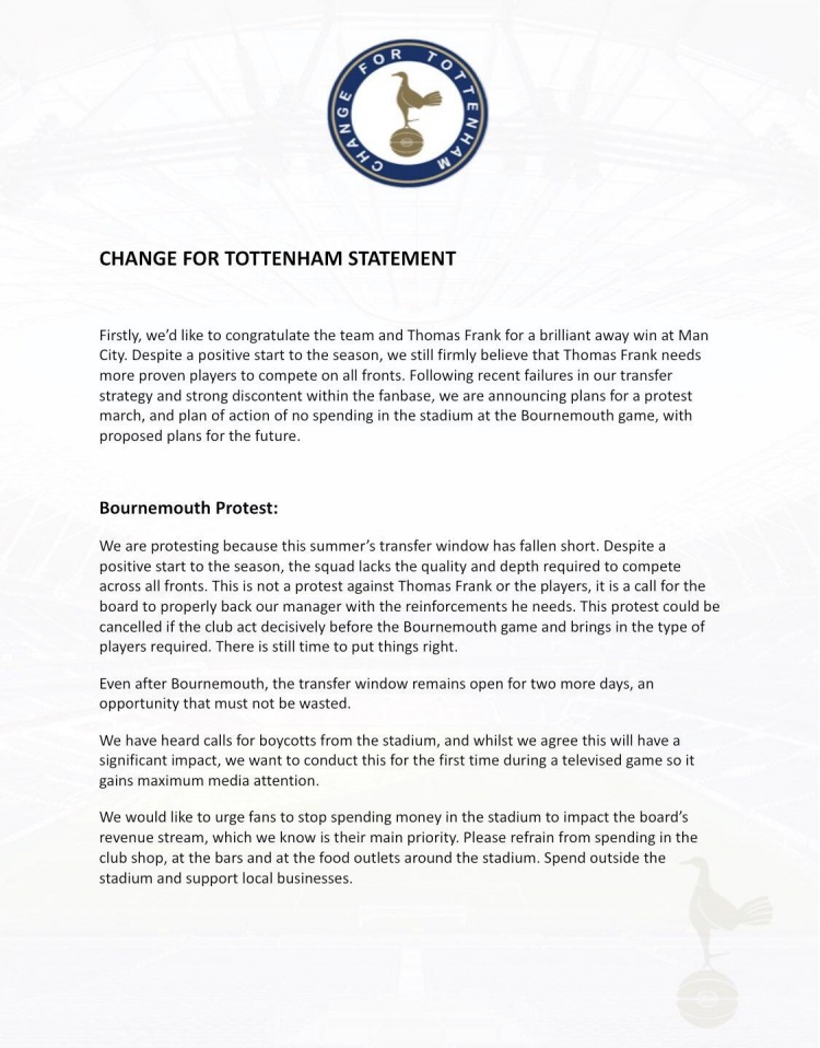 8月27日讯 热刺今夏的球员引入职责堕入了窘境,他们在转会市集屡屡受挫,由于不悦球队灾祸的转会操作,一个名为“change for tottenham”的热刺球迷组织发布了声明,号召在周末主场对阵伯恩茅斯的比赛中对球队高层进行抗议行径。