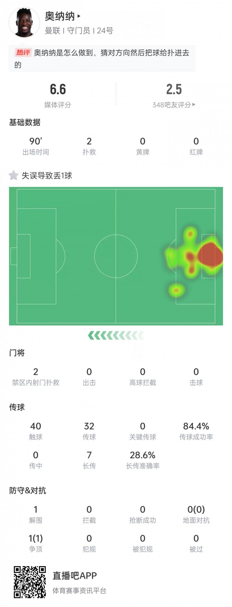 奥纳纳本场数据:作念出2次扑救&出击极端导致丢球,获评6.6分