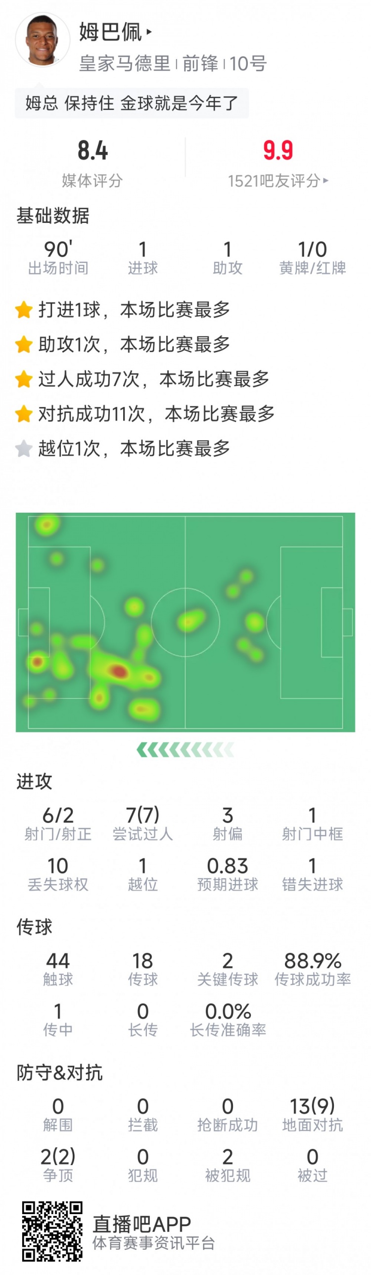 姆巴佩本场数据:1球1助攻,6射2正,1次中框,7次过东谈主均收效