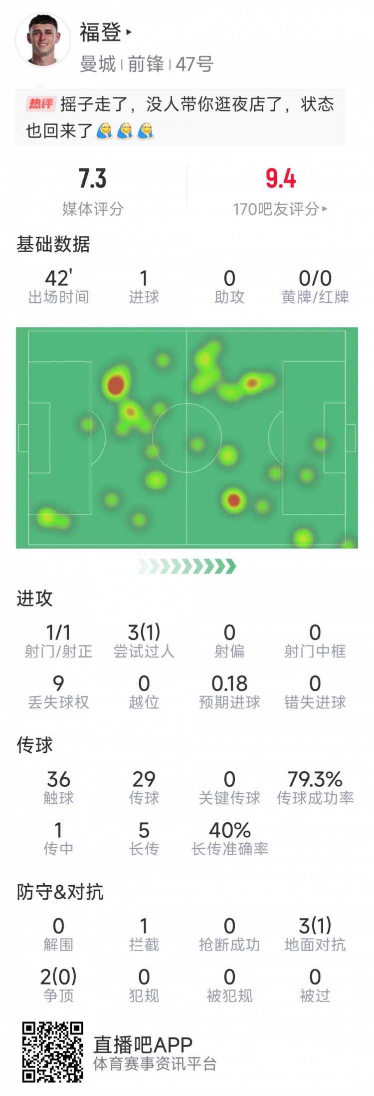 福登半场数据:1粒进球,1次射门,3次过东谈主1次奏效,1次阻难