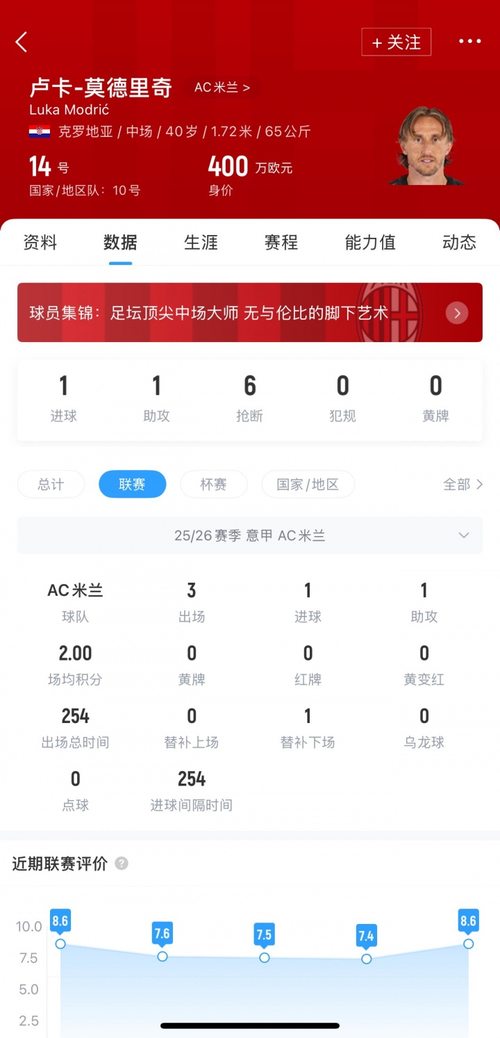 莫德里奇今夏加盟米兰,代表米兰出战4场认真比赛,其心仪甲3轮1球1助,匡助米兰得回连胜。