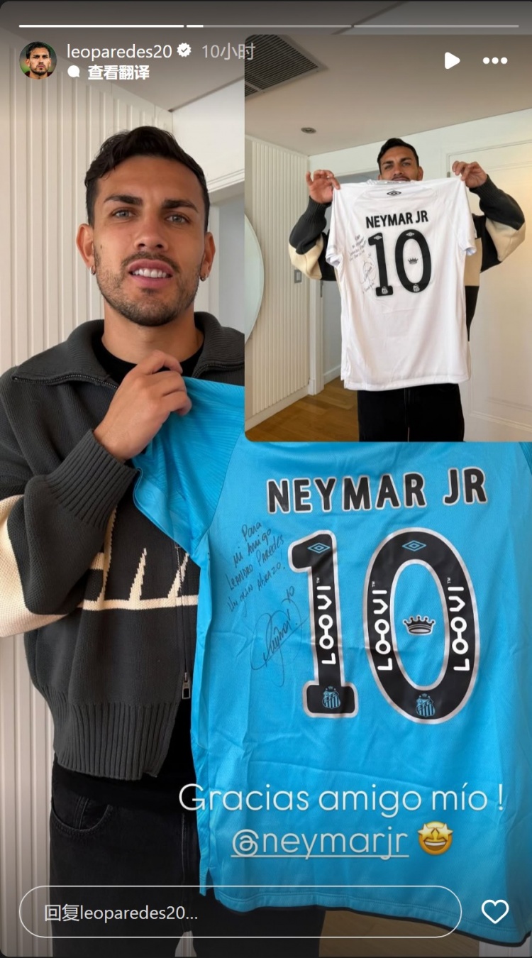 帕雷德斯社媒晒出展示内马尔球衣的相片,配文:“谢谢你,我的一又友。”