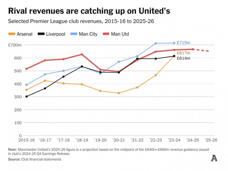 若预言成真,这将是英超时间曼联收入初度跌出前三,也仅是第二次不在前二。更值得警惕的是,在25/26赛季,曼联预期收入将停滞以致下落,反应出厄运的竞技发扬正导致俱乐部在财务上被多个敌手超越。