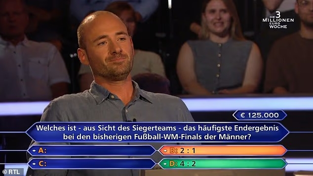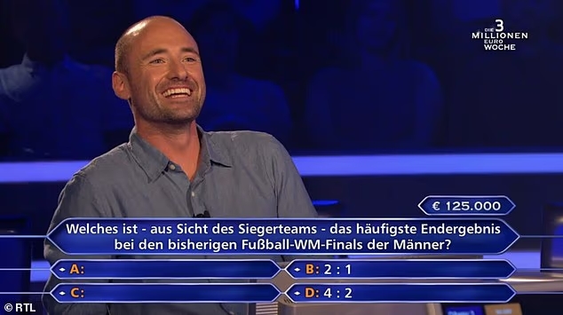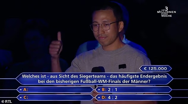 10月11日讯 在德国版的《谁念念成为百万财主》才气竞赛节目中,一位参赛者没能修起对宇宙杯决赛的比分,错失12.5万欧元(约103万东说念主民币)奖金。
