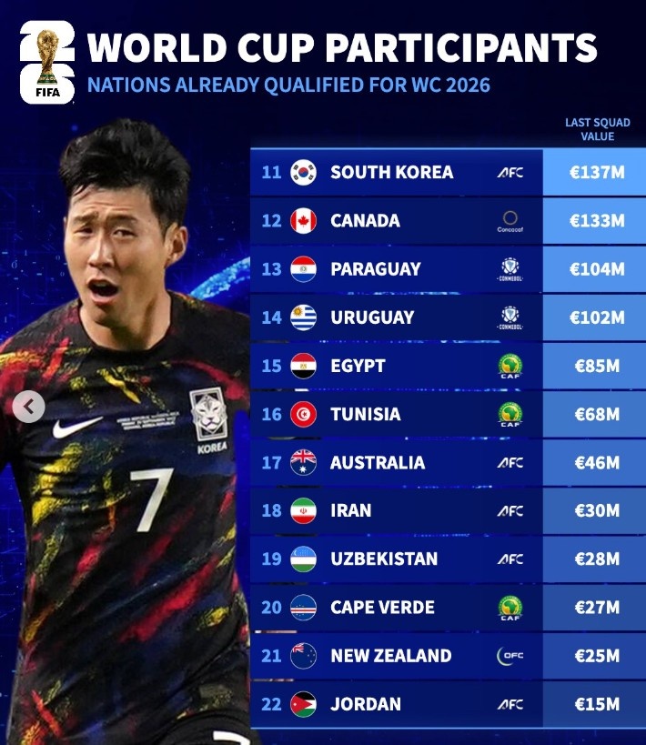现在晋级寰宇杯球队身价:巴西、阿根廷前二,佛得角第20位