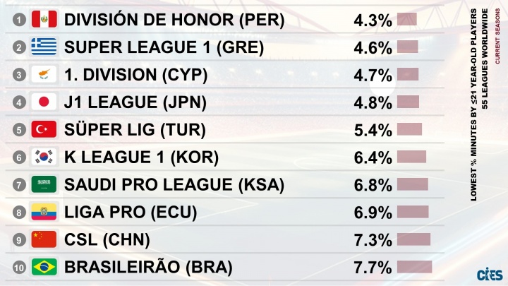 10月18日讯 近日,足球巨擘统计机构CIES发布最新统计,大家55个联赛中U21球员出场时辰占比最少的联赛,秘鲁联赛4.3%居首,J联赛4.8%第4,K联赛6.4%第6,中超7.3%第9。
