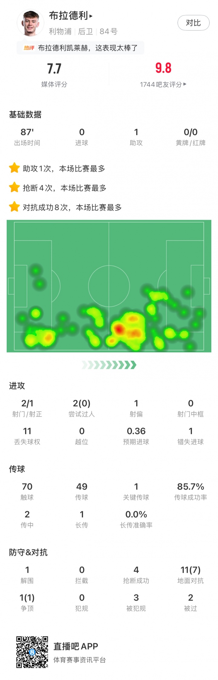 本场比赛利物浦右后卫布拉德利阐扬出色踢满全场,4次过东谈主3次告捷,孝顺2次突围、1次阻扰、3次抢断,造了维尼修斯黄牌。布拉德利也当选利物浦队内本场最好。