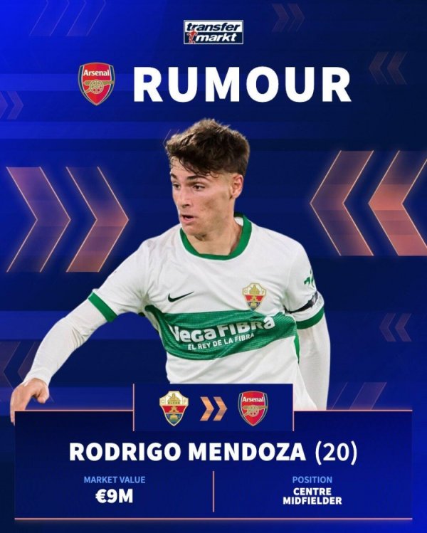 12月1日讯 据罗马诺的报谈,阿森纳在存眷现服从于西甲埃尔切队的20岁中场球员门多萨(Rodrigo Mendoza)。 门多萨是西班牙原土球员,曾入选西班牙U21队,本赛季到目下规模,他代表埃尔切出场11次,有过2个进球。门多萨和埃尔切的协议2028年到期,该协议中有2000万欧的解约金条件。 门多萨目下引了不少俱乐部的存眷,阿森纳的球探已在10月至11月时分,现场不雅看了两场门多萨的比赛。......查看更多