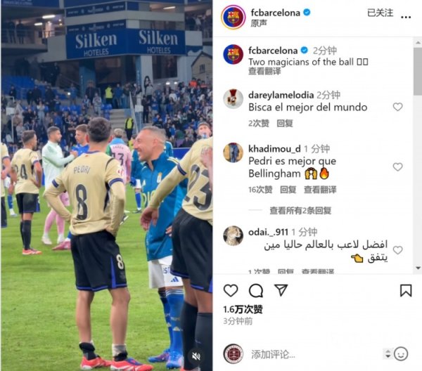 9月26日讯 西甲第6轮比赛,巴萨客场3-1打败皇家奥维耶多。 巴萨中场佩德里赛后与皇家奥维耶多40岁中场卡索拉疏浚,巴萨官方社媒晒出视频,配文:“两位球场魔术师。”......查看更多