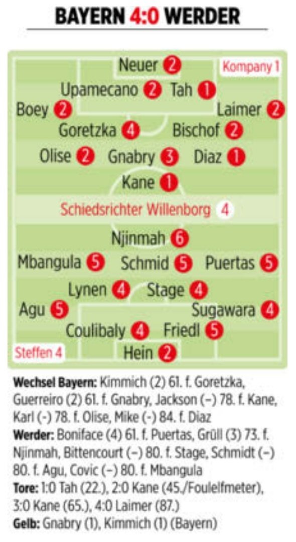 拜仁vs不莱梅图片报评分:凯恩、若纳坦-塔、迪亚斯1分最高