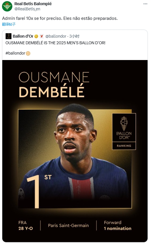 贝蒂斯英语官推转发登贝莱:若有必要我会发十遍,他们还没准备好