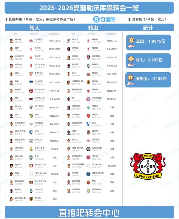 大换血!勒沃库森夏窗:1.25亿卖维尔茨,宽萨、蒂尔曼成队史标王