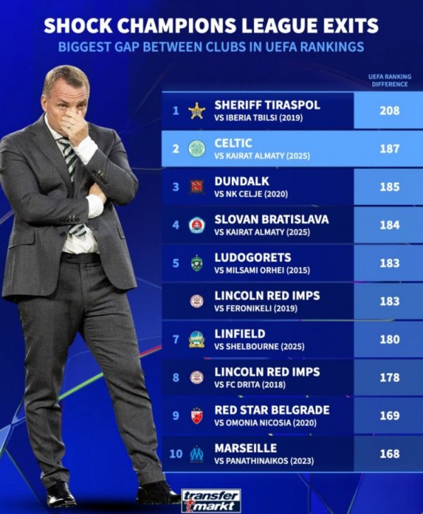8月28日讯 欧冠附加赛次回合,凯尔特东谈主在点球大战中不敌阿拉木图凯拉特,目送敌手队史初次闯进欧冠正赛。凭证德国转会市集的统计,凯尔特东谈主本次被淘汰是欧冠历史交锋两队欧足联积分差距第二大。 以下为欧冠历史交锋两队积分差距top10: 谢里夫警长VS伊比利亚第比利斯(2019年):208 凯尔特东谈主VS阿拉木图凯拉特(2025年):187 邓多克VS采列(2020):185 布拉迪斯拉法VS阿拉木图凯拉特(2025年):184 卢多戈雷茨VS奥尔海伊改日(2015年):1......查看更多