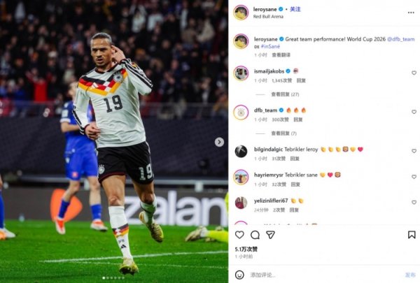 11月18日讯 德国队在本轮世初赛6-0完胜斯洛伐克,也得手晋级2026宇宙杯。萨内双响立功。 第36分钟,维尔茨送出长传助攻,萨内斜插杀入禁区单刀破门。 第41分钟,沃尔特马德左路逼抢劫下球权,又是维尔茨禁区线近邻送出小挑传,后点萨内包抄垫射破门。 萨内也在赛后通过社媒晒出我方的庆祝照,并配文:“全队踢出精彩的弘扬!2026宇宙杯!”......查看更多