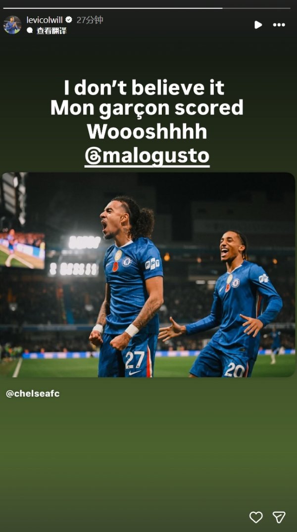 古斯托生计处子球!科尔维尔社媒辱弄:不敢信!我的男孩进球了